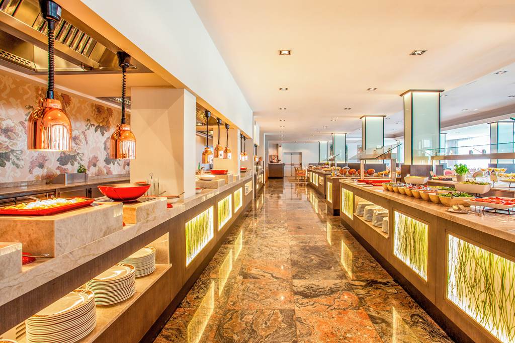 The main buffet restaurant serves breakfast and dinner with show cooking, local and international options, and a dedicated kids’ buffet and highchairs for younger diners. Expect live-cooking stations, colourful salads and a wide choice of hot dishes. The hotel requests that beachwear is not worn here.
