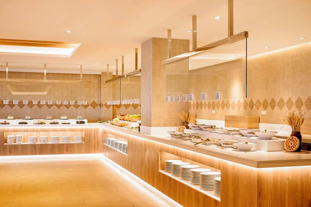 The light-filled buffet restaurant serves breakfast, lunch and dinner, with show-cooking at dinner and plenty of choice for pescatarians, vegetarians and families. Expect fresh salads, grilled fish, international favourites and a tempting dessert counter. Highchairs are available for younger guests. The hotel kindly asks that beachwear isn’t worn inside.