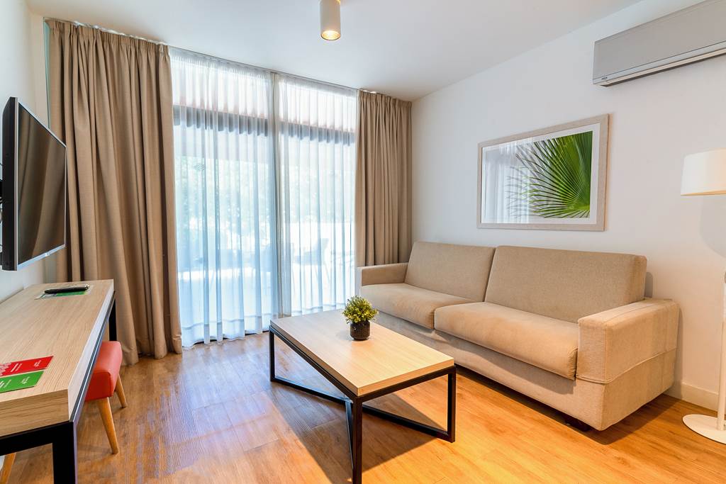 Cool, bright and contemporary apartments featuring a separate bedroom and living area, ideal for couples or small families. Each has a furnished balcony with sunbeds, plus: