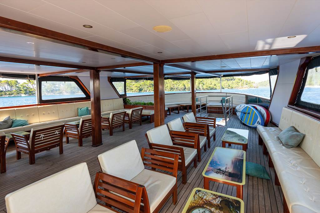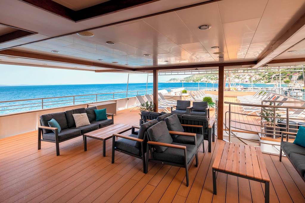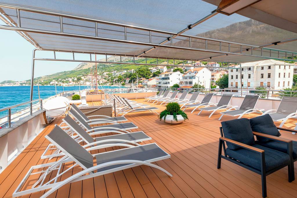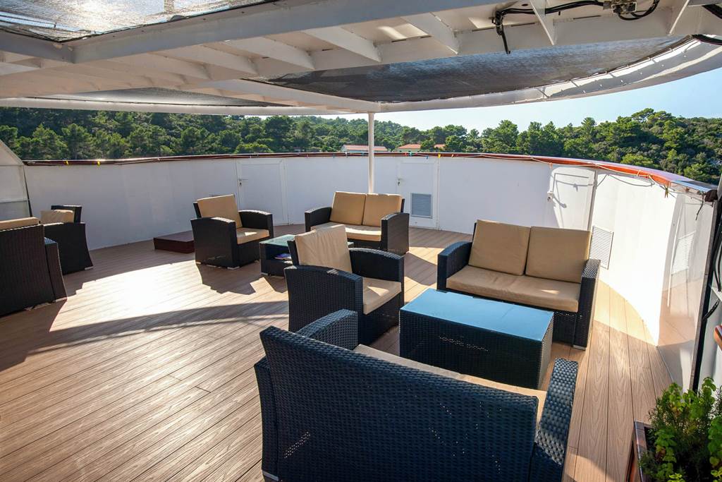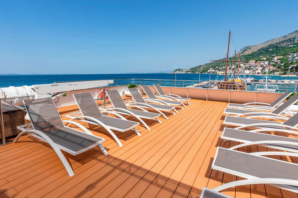 The top sun deck is typically furnished with loungers, perfect for sunbathing between stops or relaxing with a book as you sail.