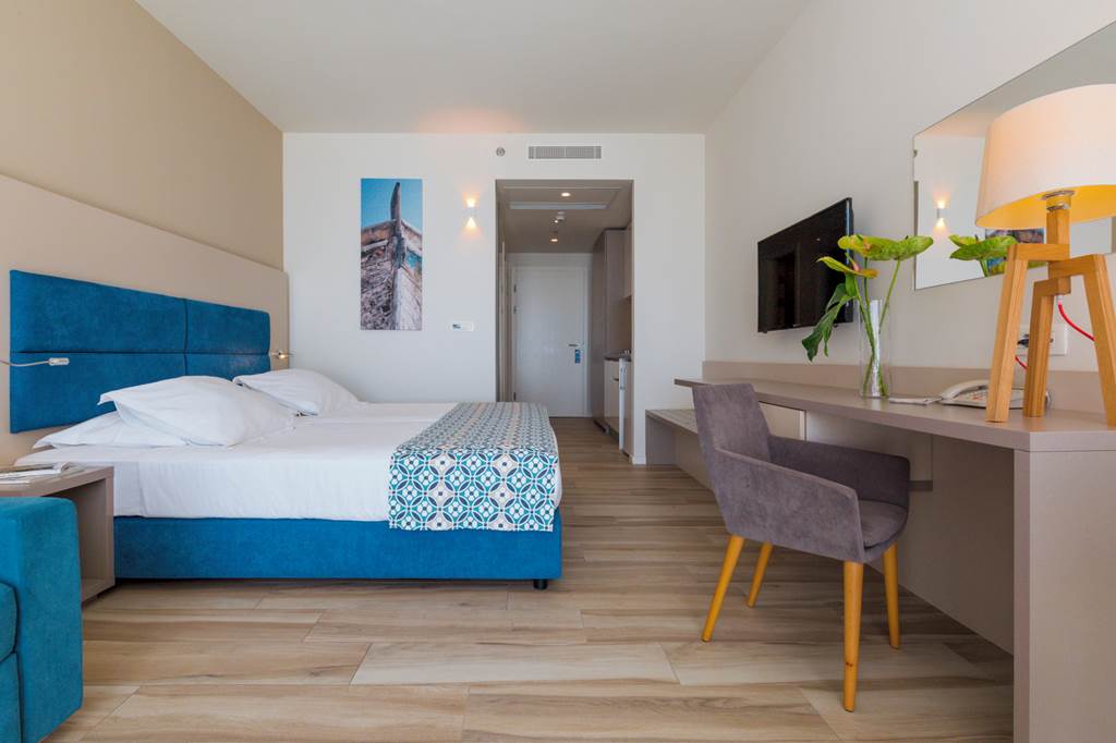 As the standard studios but positioned to enjoy sea views from the balcony. Kitchenette facilities step up slightly with double cooking rings, microwave, toaster, fridge, kettle and coffee-making facilities, plus USB charging ports alongside the usual TV, Wi‑Fi, safe, air conditioning and shower room.