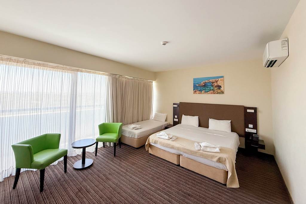 Sleeps 3–4. Designed for families needing extra space, these rooms come with a double or twin beds plus additional sofa or camp beds for children. Facilities include balcony, air conditioning, flat-screen TV, free Wi‑Fi, fridge, kettle, safe and bathroom with bath and shower attachment or shower. Available with side sea view or inland view.