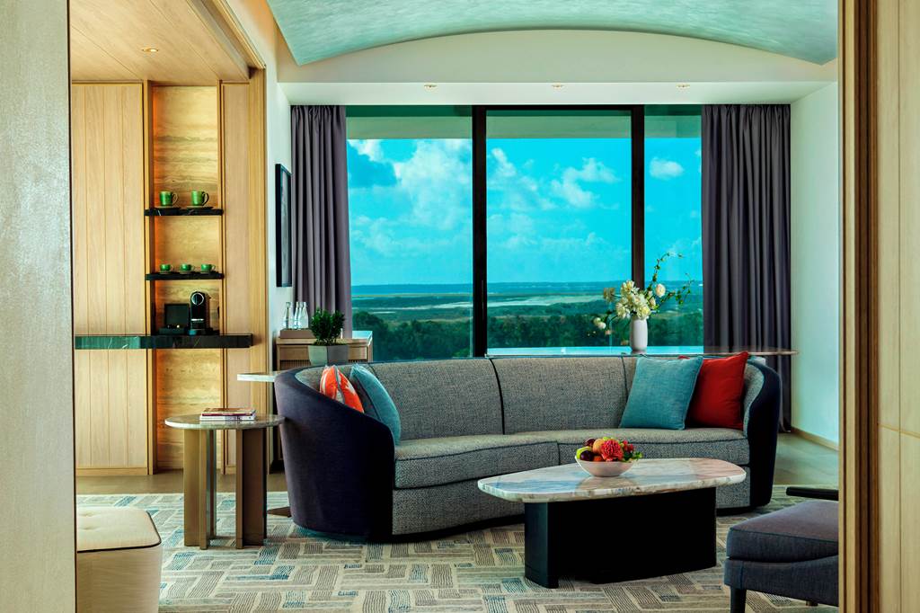 High-floor suites with impressive views and outdoor space with sunbeds, perfect for lazy afternoons between pool sessions and dinners. Inside, you’ll find flat-screen TV, Wi‑Fi, safe, Nespresso machine, kettle, pillow menu, USB charging ports, minibar*, bathrobe and slippers and a bath plus separate shower. Turndown service and seasonal air-con (approx. April–October) come as standard.