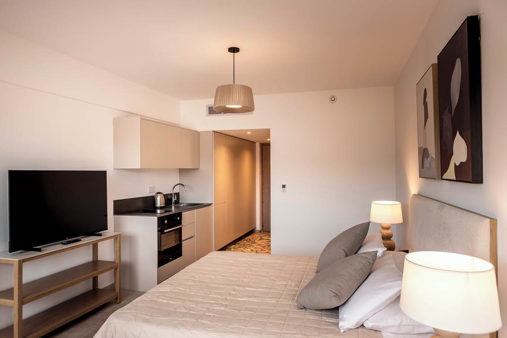Sleeps 2. Fresh, contemporary room facing inland, ideal for couples. Facilities include flat‑screen TV, free Wi‑Fi, safety deposit box, hairdryer, coffee‑making facilities, fridge, balcony, double cooking rings, oven, bathroom with bath and shower attachment, air-conditioning and daily cleaning.