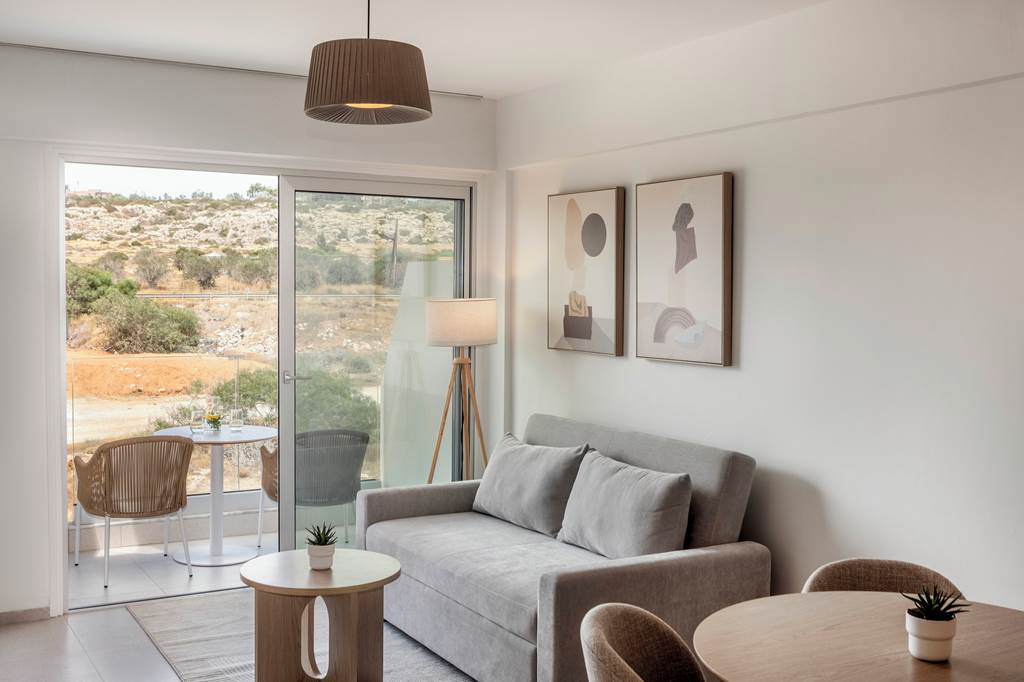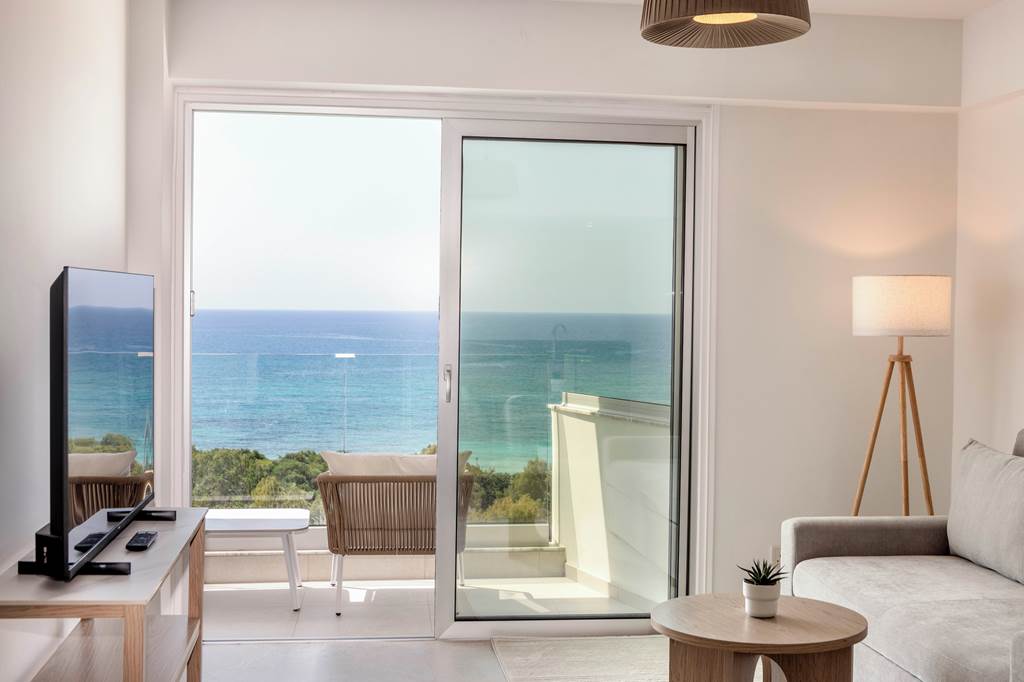 Sleeps 3–4. Family‑friendly suite with sea‑view balcony and the same facilities as the inland option: TV, Wi‑Fi, safe, hairdryer, coffee‑making facilities, double cooking rings, oven, fridge‑freezer, shower bathroom and air‑conditioning.
