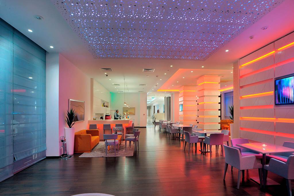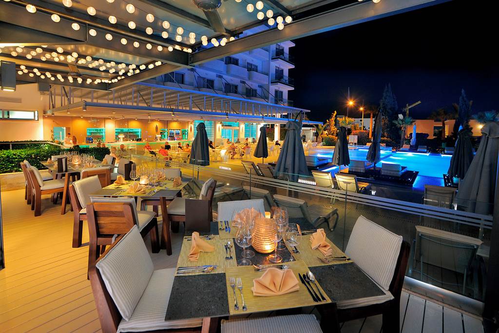 The hotel’s main dining hub is Minos Restaurant, a bright buffet venue serving international favourites and Cypriot-inspired dishes for breakfast, lunch and dinner. Expect show-cooking stations and plenty of choice for both adults and children, with highchairs available for little ones.