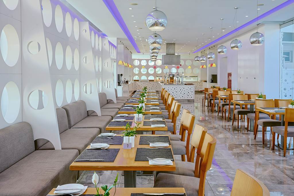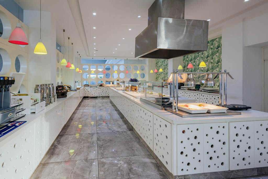 Aspelia Restaurant is the main buffet venue, serving breakfast and dinner with live show-cooking stations where chefs whip up fresh favourites while you watch. Expect an international spread with Mediterranean touches and a choice of hot and cold items. Beachwear isn’t allowed at dinner, so pack something casual-smart.