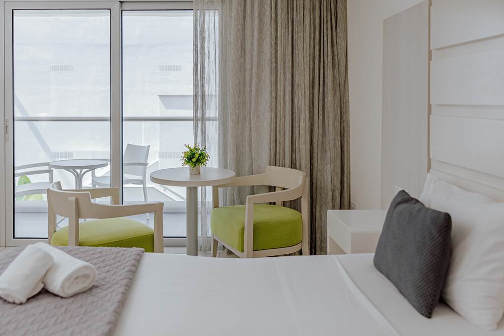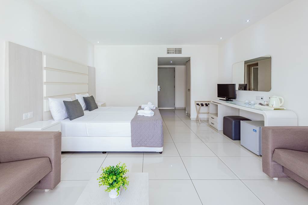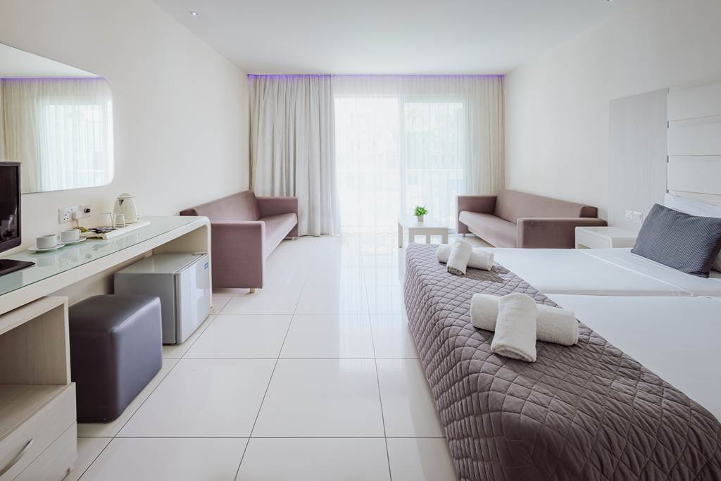 These fresh, contemporary rooms look towards the inland side of the hotel. Expect light décor, tiled floors and simple, comfortable styling – an ideal base if you’re planning to spend more time by the pool or exploring Ayia Napa.
