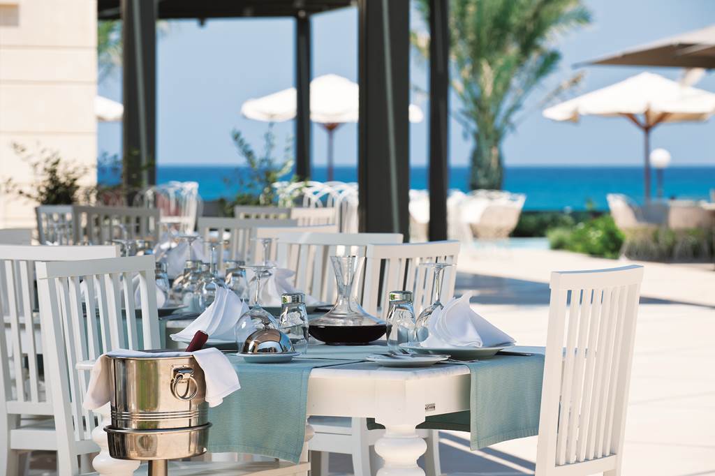 A bright buffet venue serving breakfast and dinner with show cooking. Expect Mediterranean and international dishes, salads and Greek specialities, plus options for kids. Highchairs are available. Gentlemen are usually asked to wear long trousers and beachwear is discouraged at dinner.