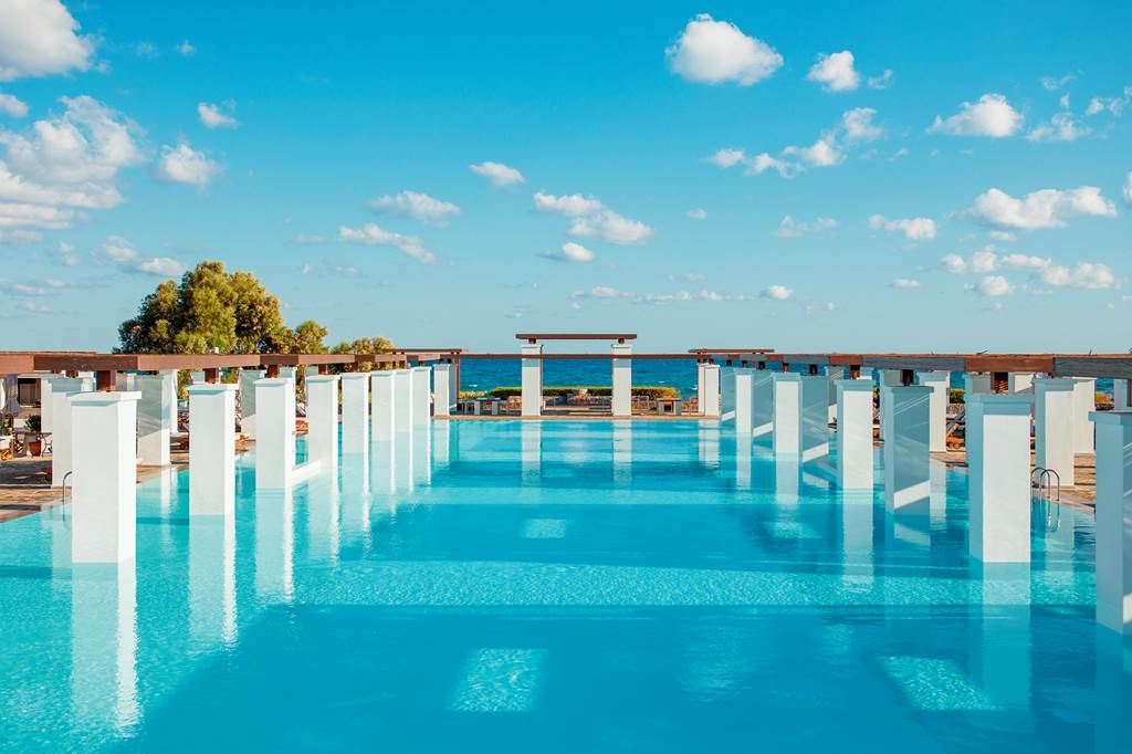 Water is the star of the show at Amirandes. At the heart of the resort you’ll find a spectacular Olympic-size outdoor saltwater pool framed by columns and loungers, with a generous sunbathing terrace and parasols. A separate freshwater children’s pool sits close by so younger guests can splash safely.