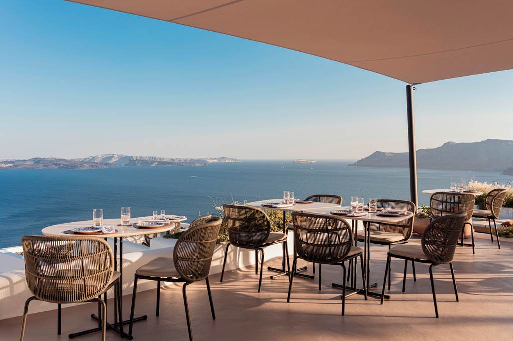 At Canaves Ena, the culinary focus is intimate and tailored rather than sprawling. The hotel’s Adami Restaurant sits by the pool terrace and serves refined Greek cuisine with a contemporary twist, from leisurely à la carte breakfasts to long lunches and candlelit dinners with caldera views. Expect fresh island produce, local olive oil, just-caught seafood and a well-curated Santorini wine list.
