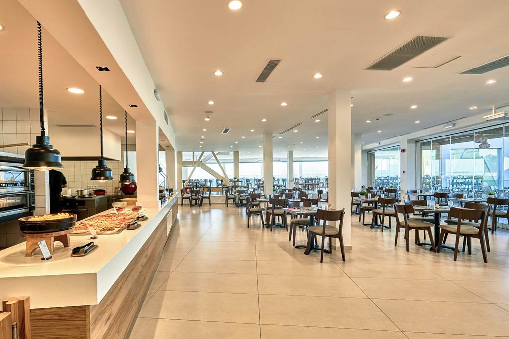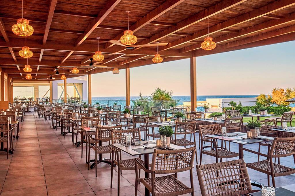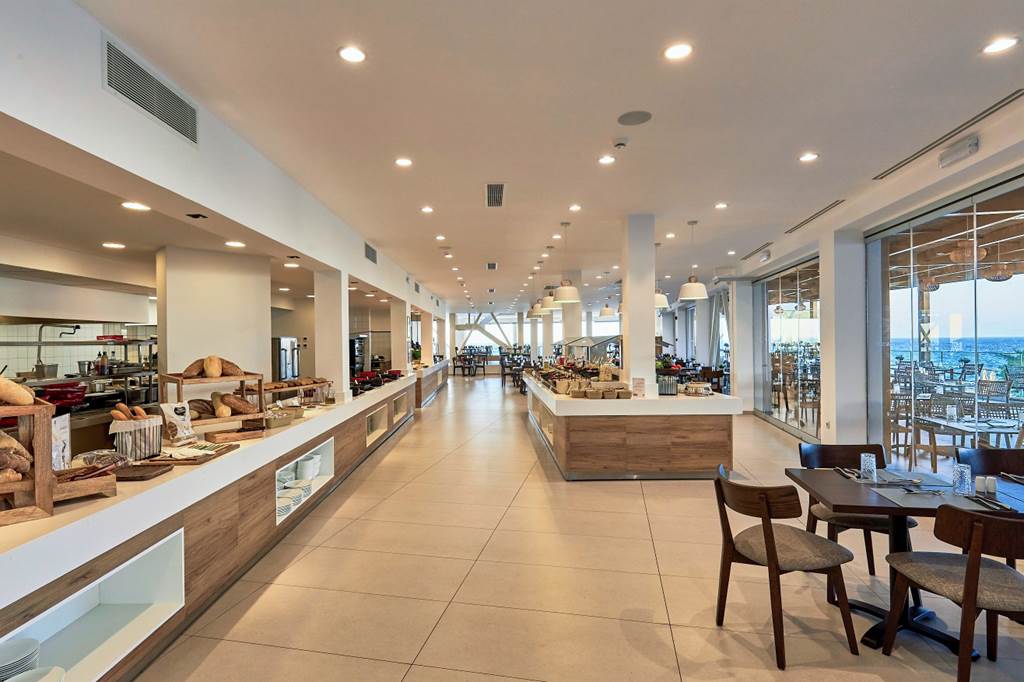 Main Restaurant – Contemporary, light-filled buffet restaurant serving breakfast and dinner, with a mix of Greek and international favourites. Expect show-cooking stations, salads, grills and plenty of vegetarian-friendly options.