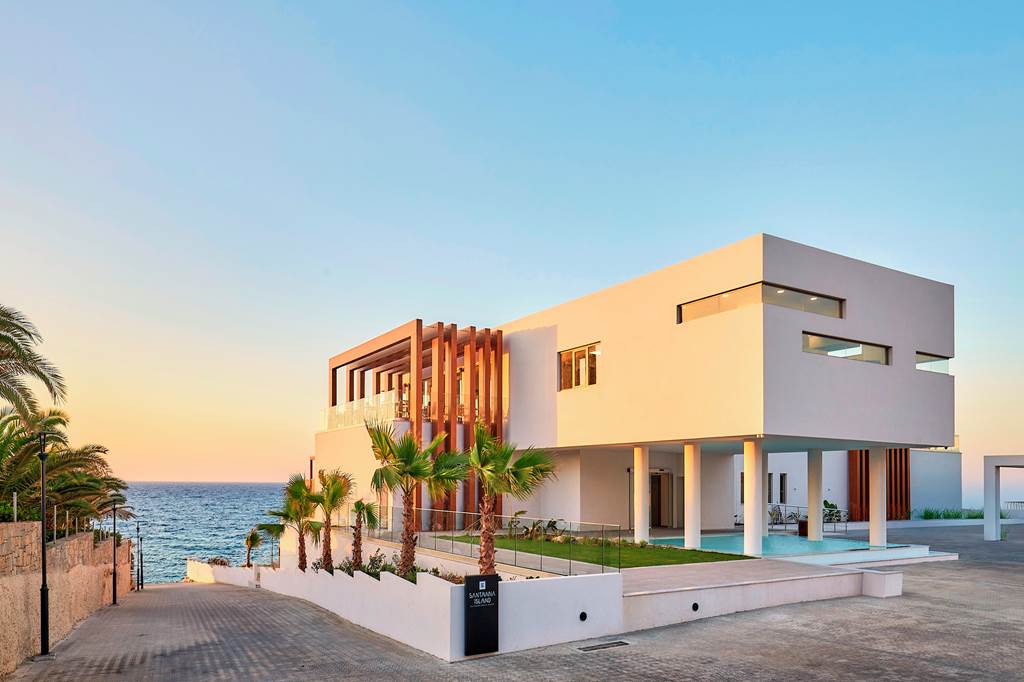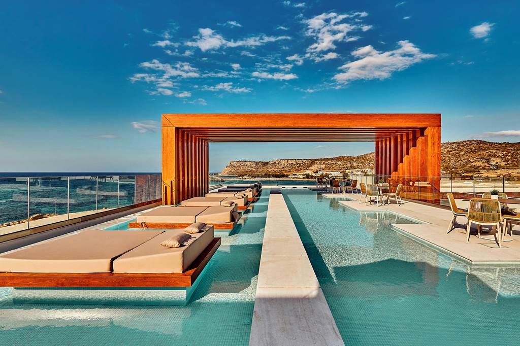 Clean-lined architecture, glass-fronted pools and endless sea views set the tone at Enorme Santanna Island. Loungers line the infinity-style terraces, while the gentle palette of whites, stone and wood lets the Cretan landscape do the talking. Upgrade to a swim-up or private-pool room and you can step straight from your terrace into the water, then wander to one of the hotel’s five restaurants for long, languid meals by the sea.