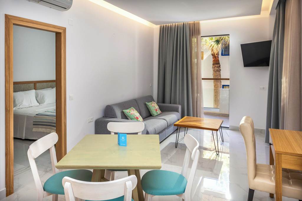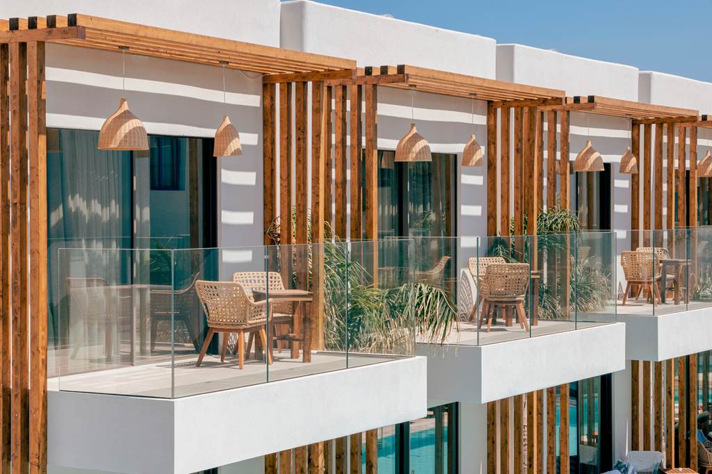 Bright and modern suites that frame views towards the Aegean. Expect a bedroom and open-plan living/sleeping area (layout can vary), with a balcony for enjoying fresh sea air. Facilities typically include: