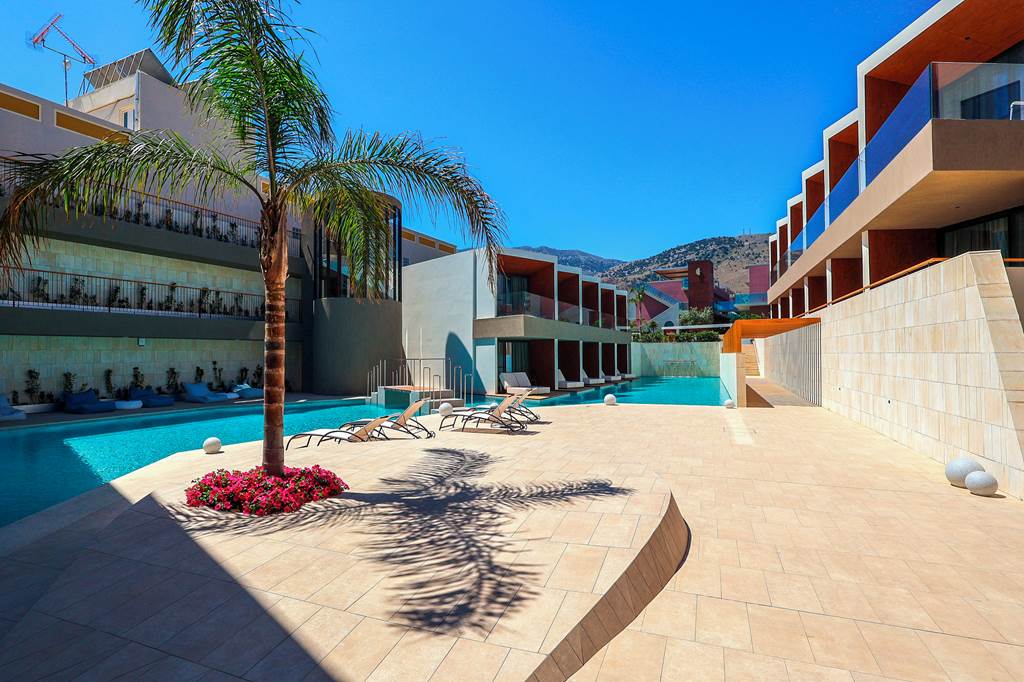 Harmony Boutique Resort enjoys a prime setting in Georgioupolis, one of Crete’s most scenic north-coast villages. Between rugged mountains and a sweeping turquoise bay, you’re right in the resort centre for tavernas, cafés, bars and shops, yet the atmosphere at the hotel remains calm and grown-up.