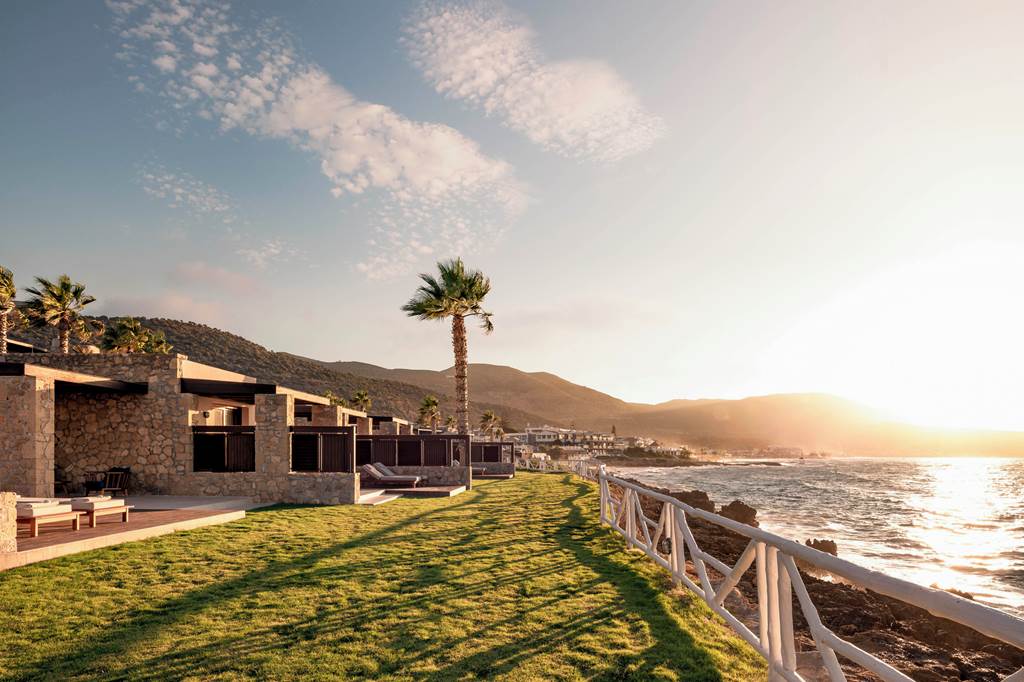 Ikaros Beach Luxury Resort and Spa sits on a privileged, gently sloping headland on Crete’s north coast, just outside the relaxed resort of Stalis. The hotel is directly on the beachfront, so you can stroll from pool to sand in a few steps, with the shimmering Aegean on one side and mountain views behind.