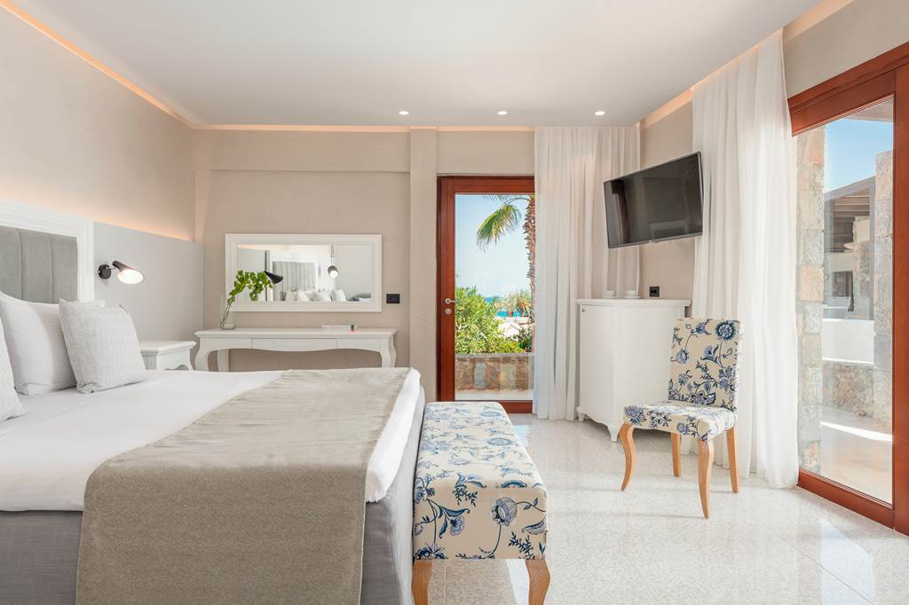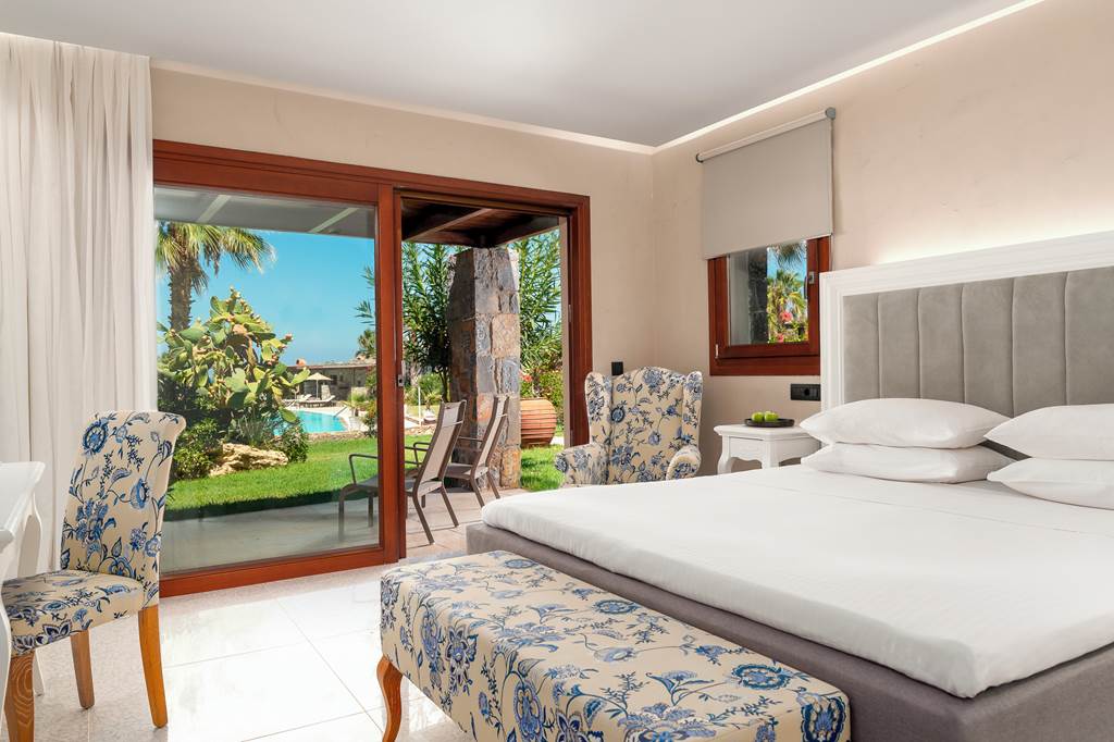 Sleeps 2–3. Spacious suites with separate sleeping and living areas and sea views. Guests can enjoy breakfast and dinner at Ayeri restaurant. In-room extras include bathrobe and slippers, pillow menu, ironing board and iron, minibar (charge) and upgraded amenities.