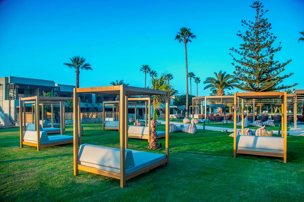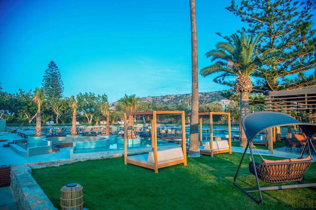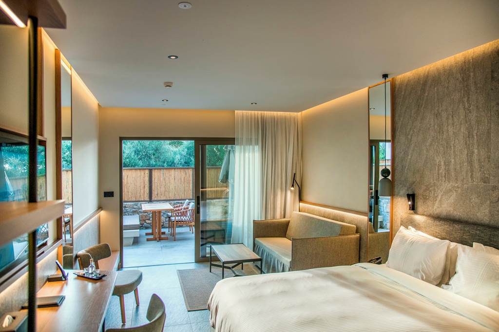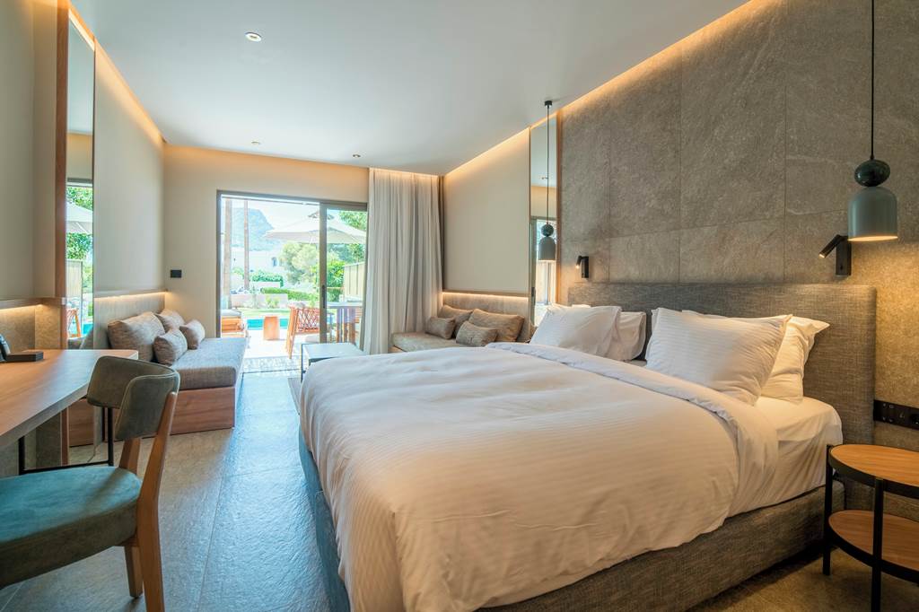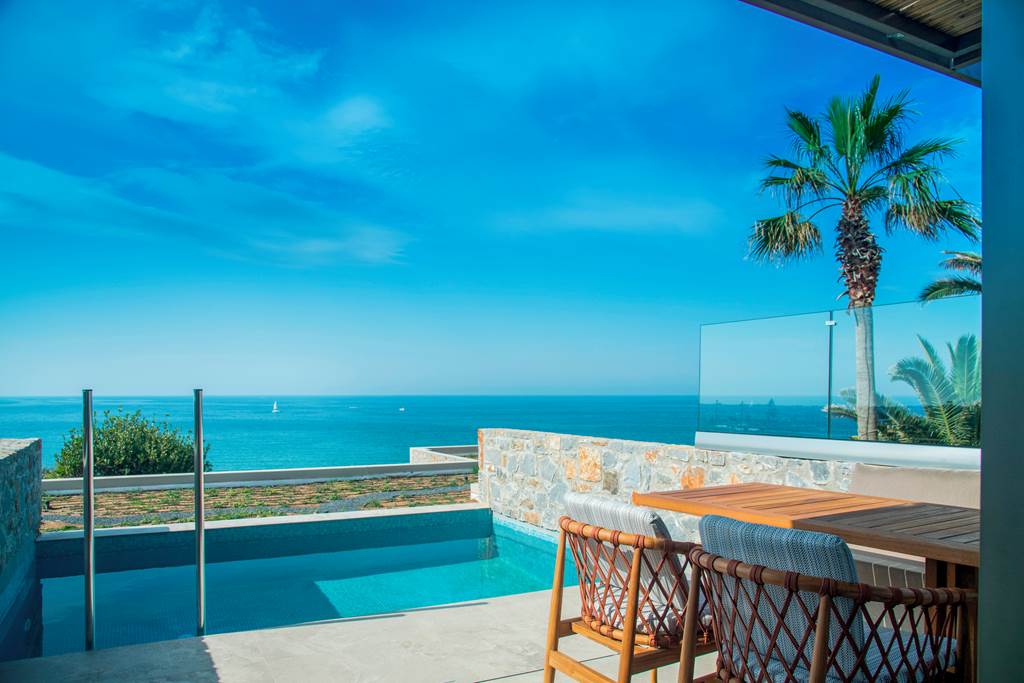 Set within the gardens, these suites deliver a real indoor–outdoor feel, with a private pool, sunbeds and stylish interiors that echo the Cretan landscape.