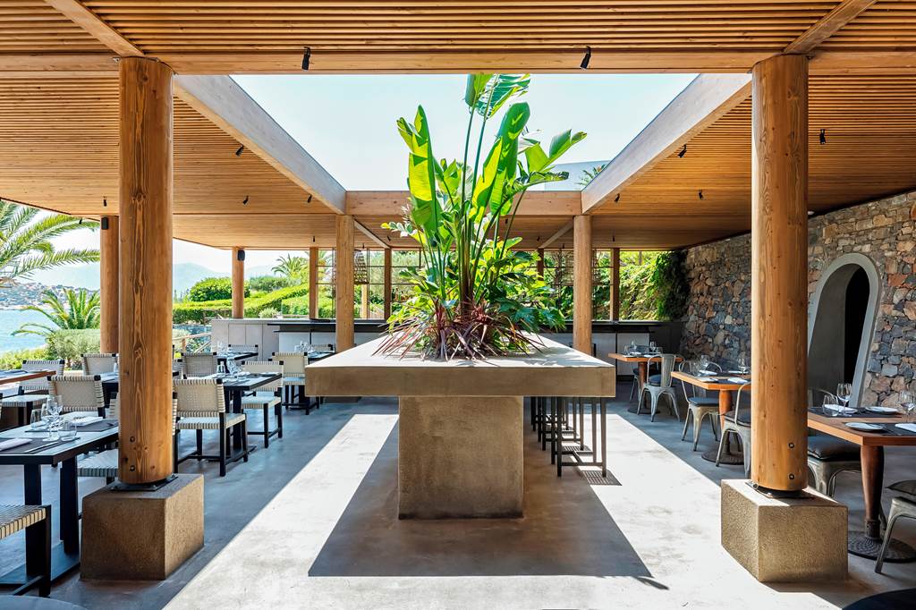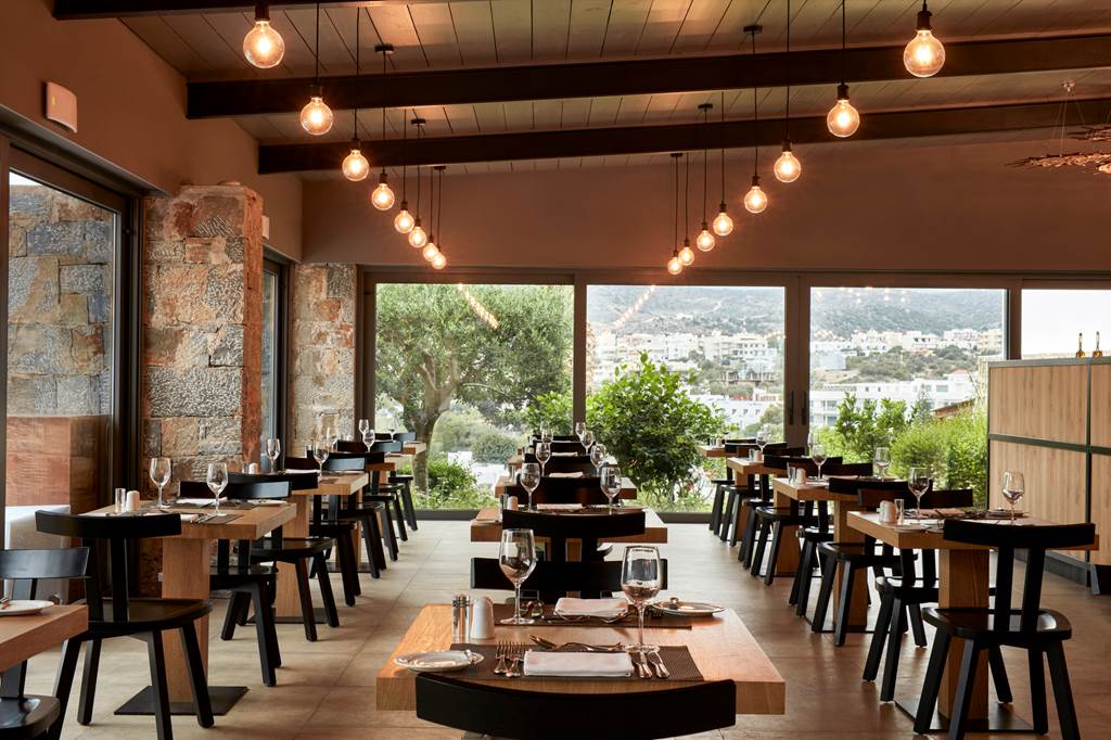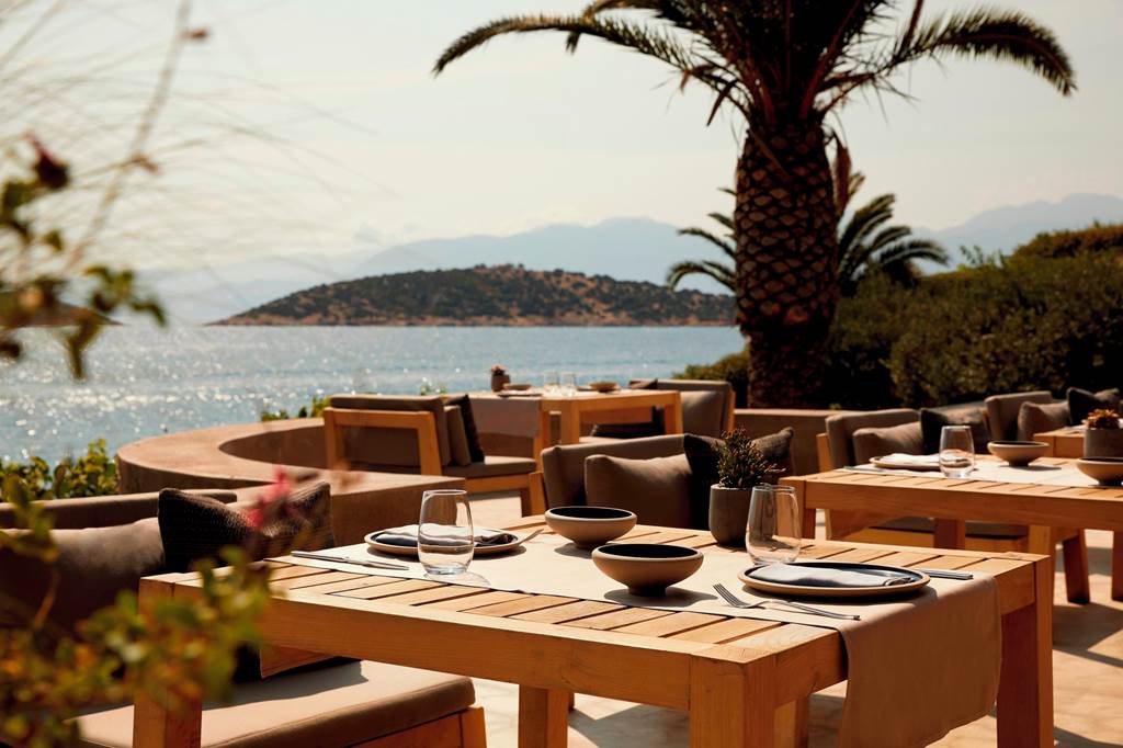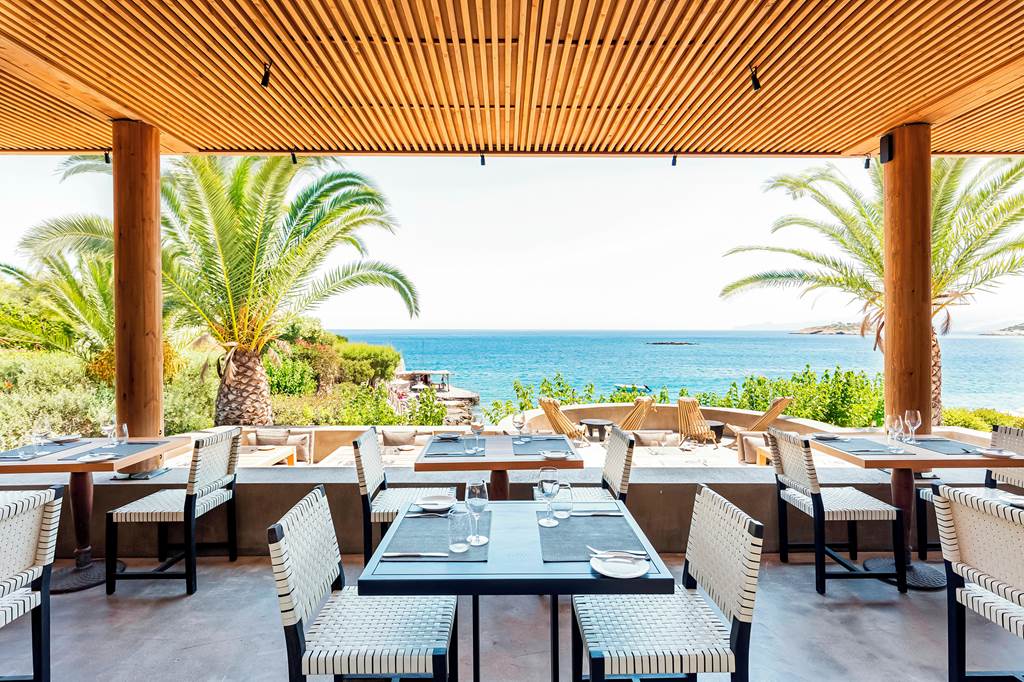 Dining at Minos Palace Resort focuses on local, seasonal produce and elegant, relaxed spaces that showcase the sea views.