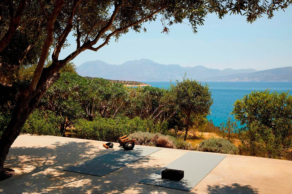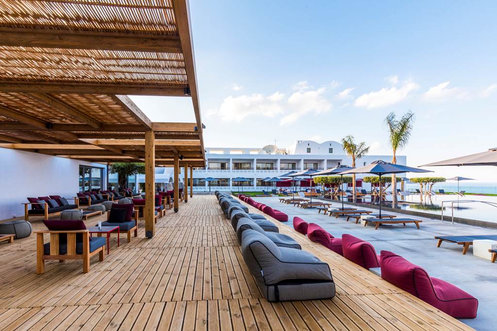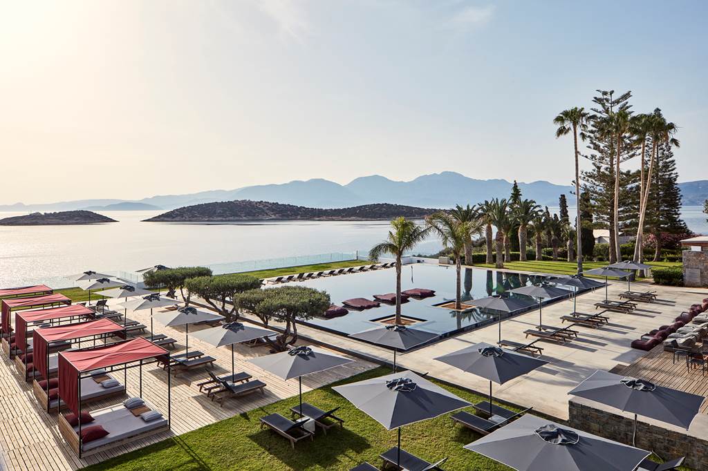 The resort’s showpiece is its outdoor freshwater infinity pool, seemingly spilling straight into Mirabello Bay. A spacious sun terrace wraps around the water with sunbeds, parasols and a scattering of Balinese beds for all-day lounging. Pool towels are provided free of charge.