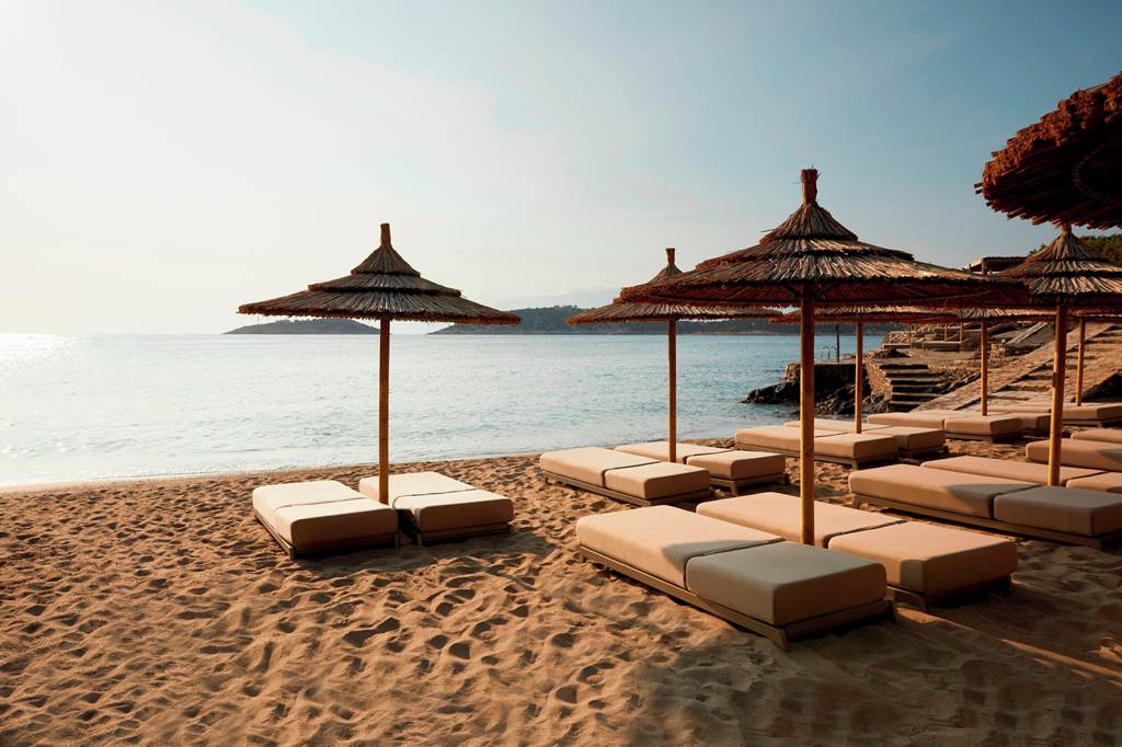 Below, a small seafront beach area (accessed via steps and paths) lets you move effortlessly between saltwater and pool time. The calm bay is ideal for a morning dip or trying a water sport with the external operator, and sundowners by the sea quickly become a holiday ritual.