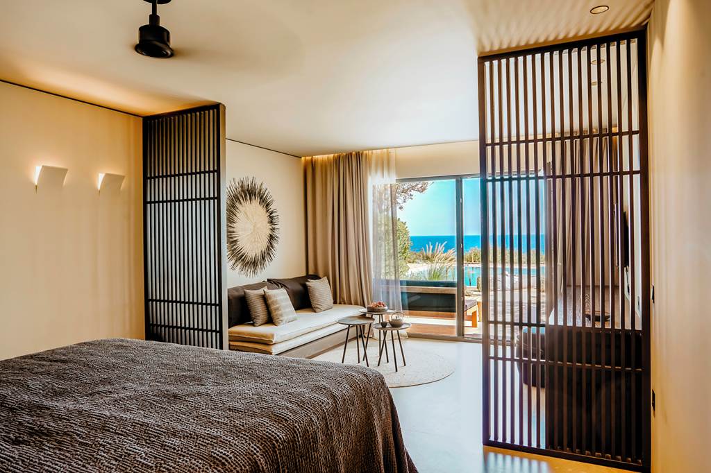 For those who spend more time outdoors, Zen Double Rooms offer the same tranquil design and amenities as their sea-view counterparts, typically with a garden or resort outlook instead of open water. Ideal value for couples who still want the full Minos Palace comfort set-up.
