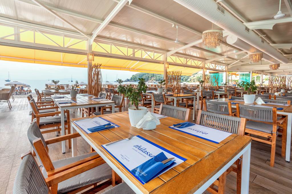 Thalassa Seaside Restaurant sits right by the sand and serves a generous buffet and à la carte mix of Greek and international dishes for breakfast, lunch and dinner, with show-cooking in the evenings and a dedicated kids’ menu.