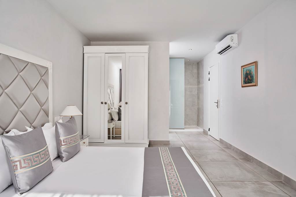A more exclusive-feeling set-up sleeping 2–3 guests, the Grand Suite offers a terrace with access to a shared pool (shared with selected rooms only), sunbeds, and a generous indoor living space. Facilities include flat screen TV, Wi‑Fi, safety deposit box, air-conditioning, shower bathroom, hairdryer, fridge, kettle and coffee facilities, and daily cleaning.