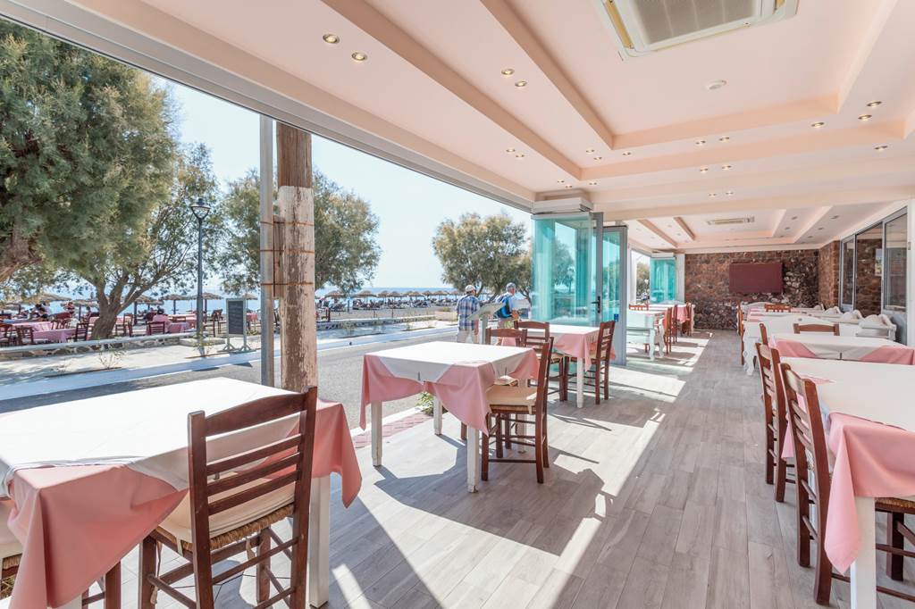 Wake up to buffet-style breakfasts with Greek and international favourites at the hotel’s Pergola restaurant, then return for lazy terrace lunches or dinners overlooking the promenade. Dishes mix local recipes with international comfort food, so you can graze on meze, grilled fish and island specialities alongside familiar plates.