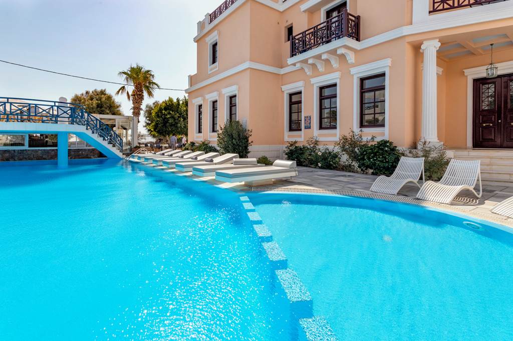 • Relax by one of three outdoor pools or on Perissa’s long black-sand beach