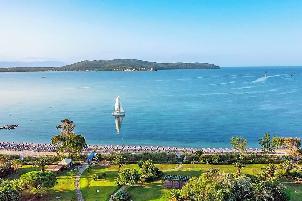 Yes. Baia di Conte has a beachfront setting with direct access to a private sandy bay. Sunbeds from the third row on the beach are available to all guests, while the first and second rows can be booked locally for an additional charge, subject to availability.