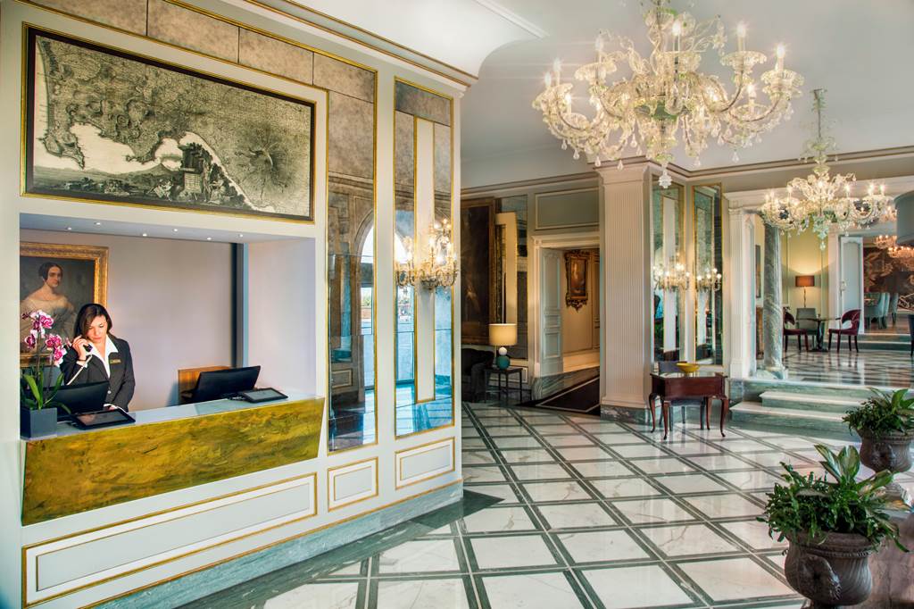 Think grand marble lobby, Murano-style chandeliers and polished brass details, all set against a cinematic backdrop of the Bay of Naples. At Grand Hotel Santa Lucia, you step out of the door straight onto the Lungomare promenade, with harbourfront cafés, views of Vesuvius and the timeless silhouette of Castel dell’Ovo just along the water’s edge.