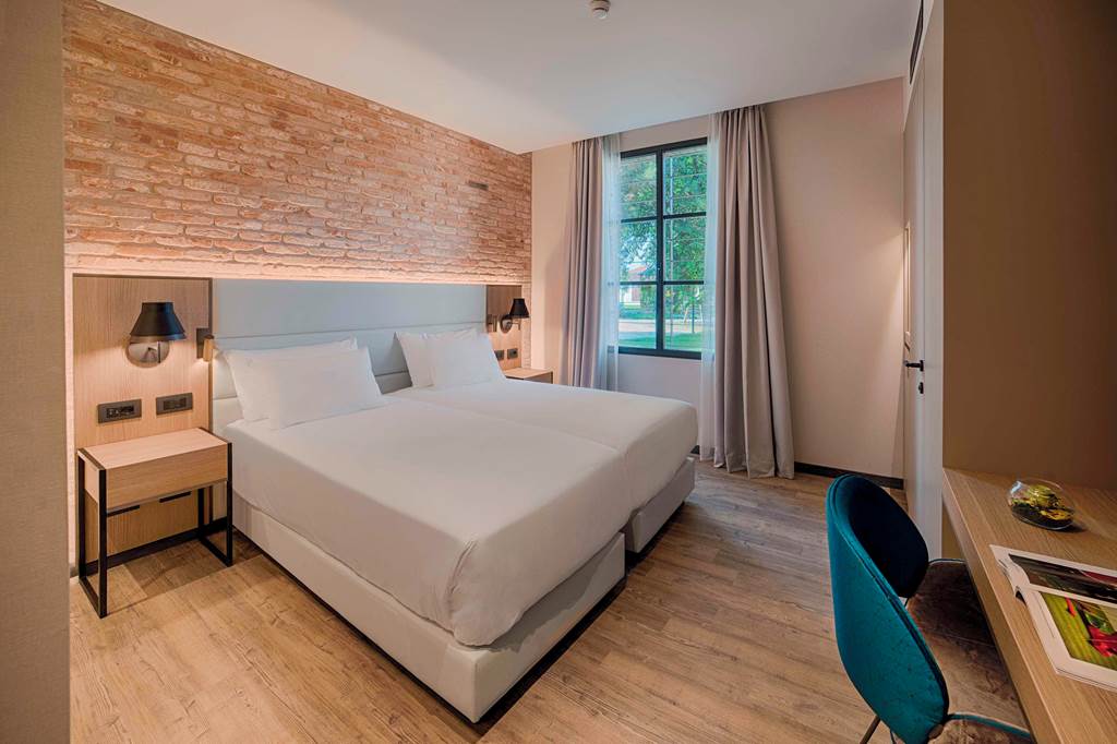 Relaxed, design-led rooms with views towards greenery or internal courtyards. Expect a double or twin beds, modern bathroom with shower, air-conditioning/heating, TV, Wi-Fi and a work desk. Some have space for an extra bed or sofa bed for a third guest.