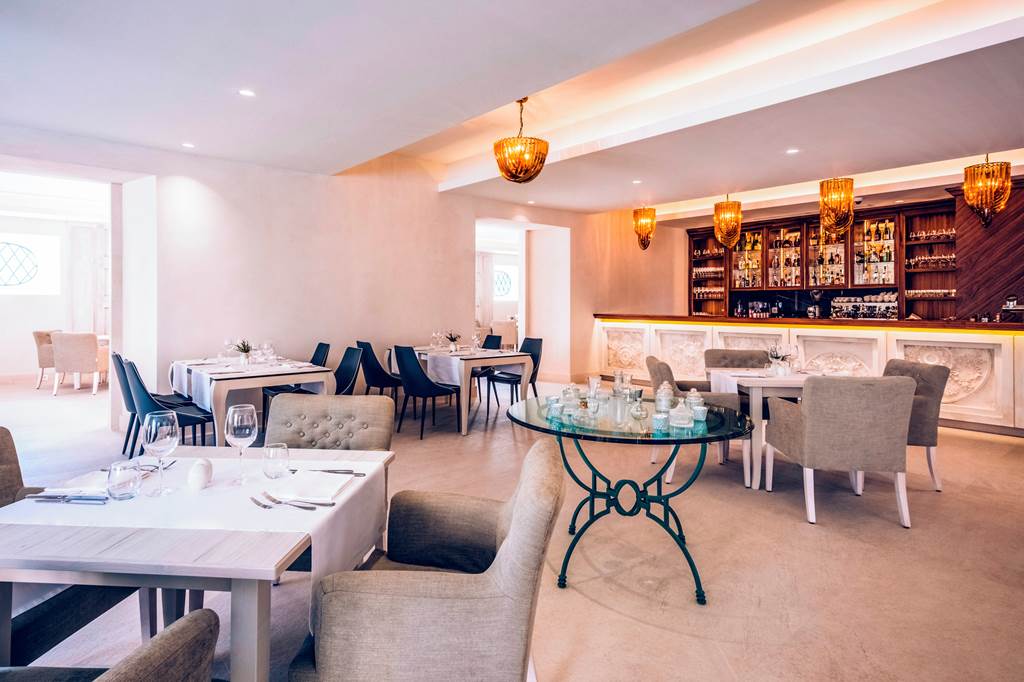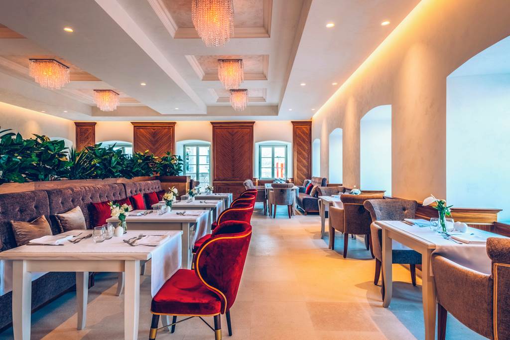 Start your day with a generous breakfast in refined surroundings – think freshly baked pastries, local cheeses and charcuterie, hot dishes, fruit and barista‑style coffee, all typically served in a light‑filled restaurant space with stone arches and bay views.
