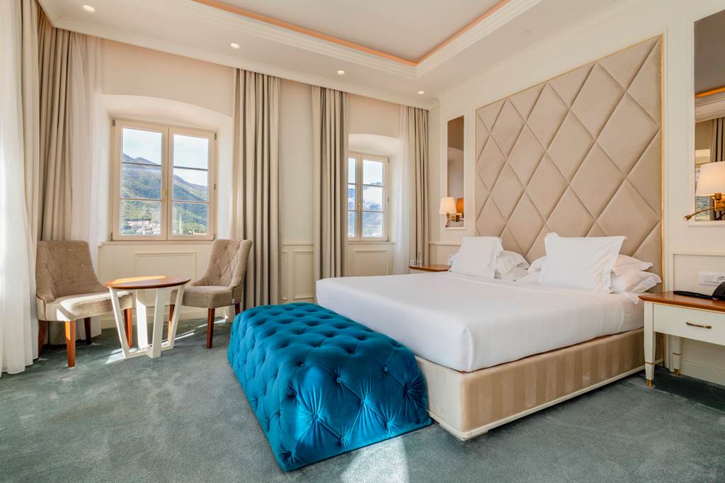 Upgrade to enjoy framed vistas of Kotor Bay and the surrounding mountains. Bay‑view rooms mirror the facilities of the elegant doubles but add that sweeping seascape when you open the curtains – particularly magical at sunrise and sunset.