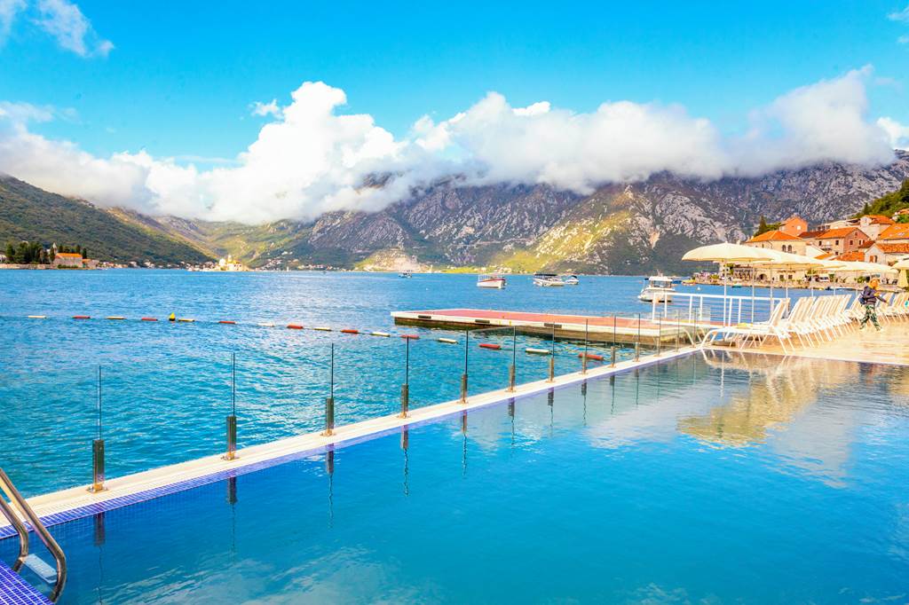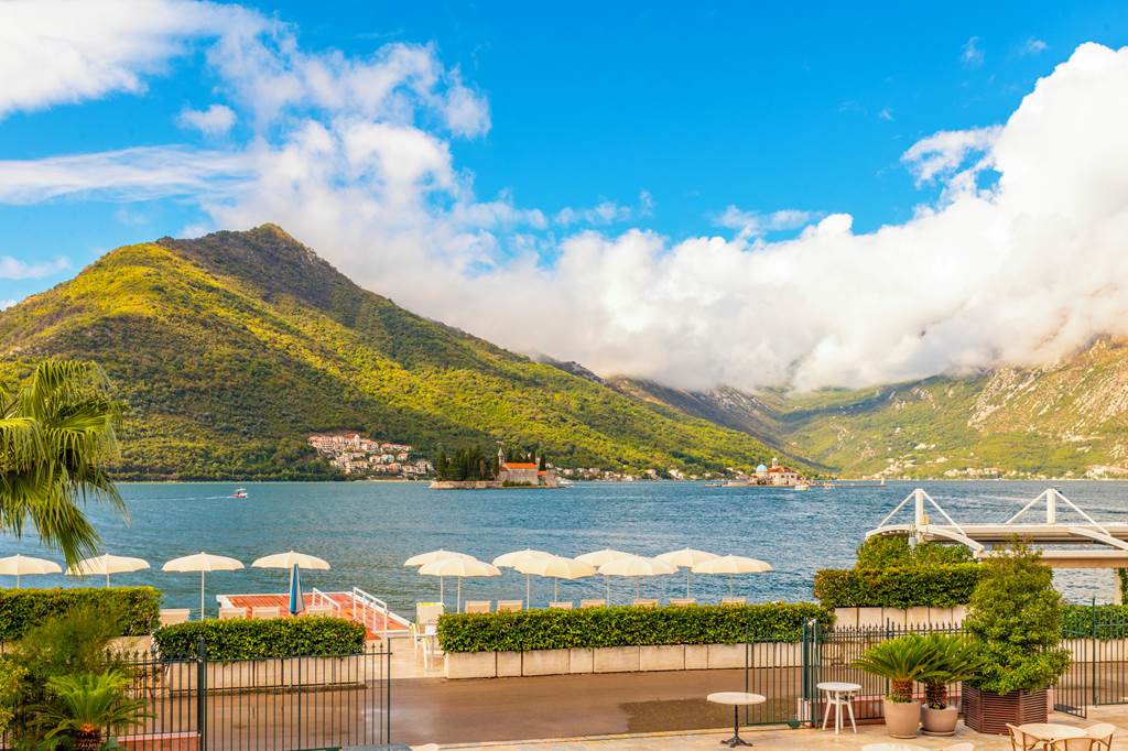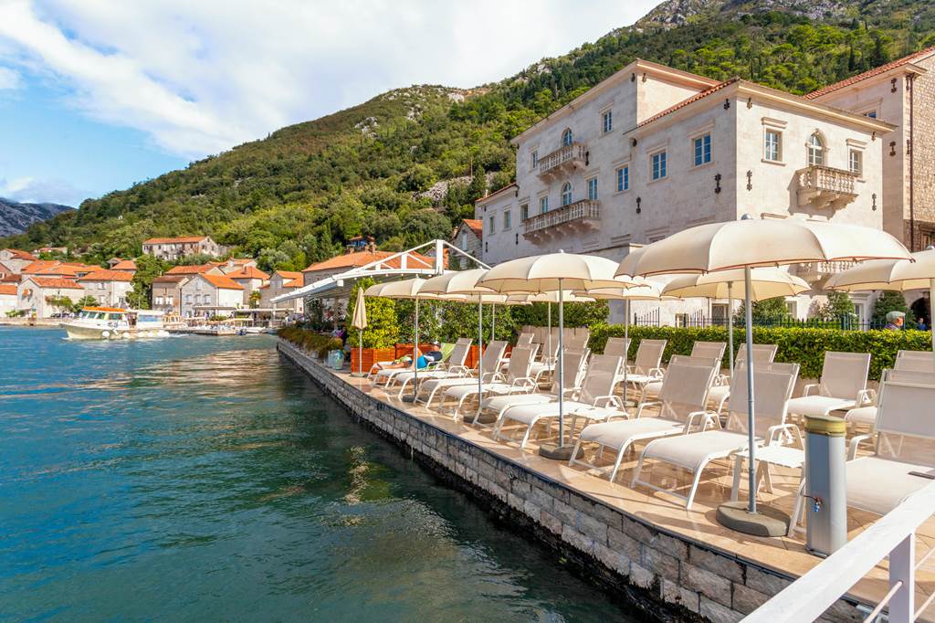 The hotel sits right on the waterfront in Perast, one of the prettiest villages on Kotor Bay. Cobbled lanes, baroque churches and traditional stone houses line the promenade, while the famous islets of Our Lady of the Rocks and St George sit just offshore.