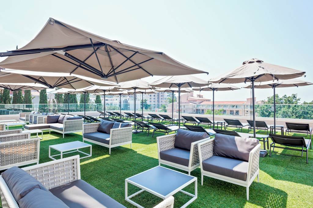 The outdoor pool is framed by smart loungers and parasols, with modern tiling and landscaping that echo the hotel’s clean-lined design. It’s a calm spot for reading and sunbathing between beach trips, and there’s usually a separate shallow section or integrated steps for easier access to the water.