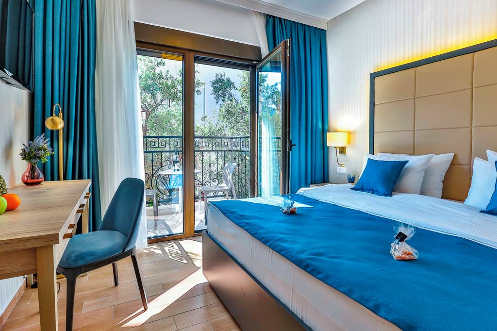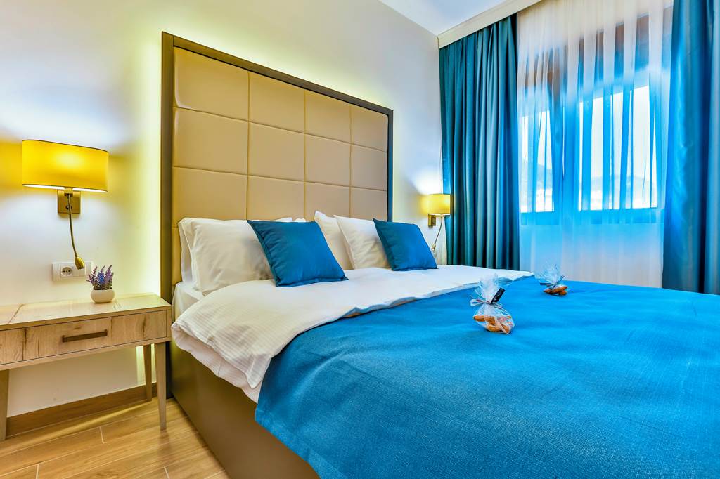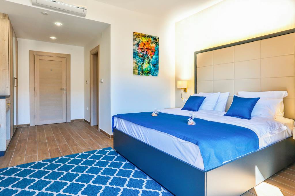 Expect clean, contemporary décor with tiled floors, light wood furnishings and neutral colours that keep rooms feeling fresh in summer. Standard doubles typically include a double bed or twin beds, private bathroom with shower, air-conditioning, satellite TV and a small fridge or minibar. Many rooms feature a balcony or terrace, some with partial views over Petrovac’s rooftops and surrounding hills.