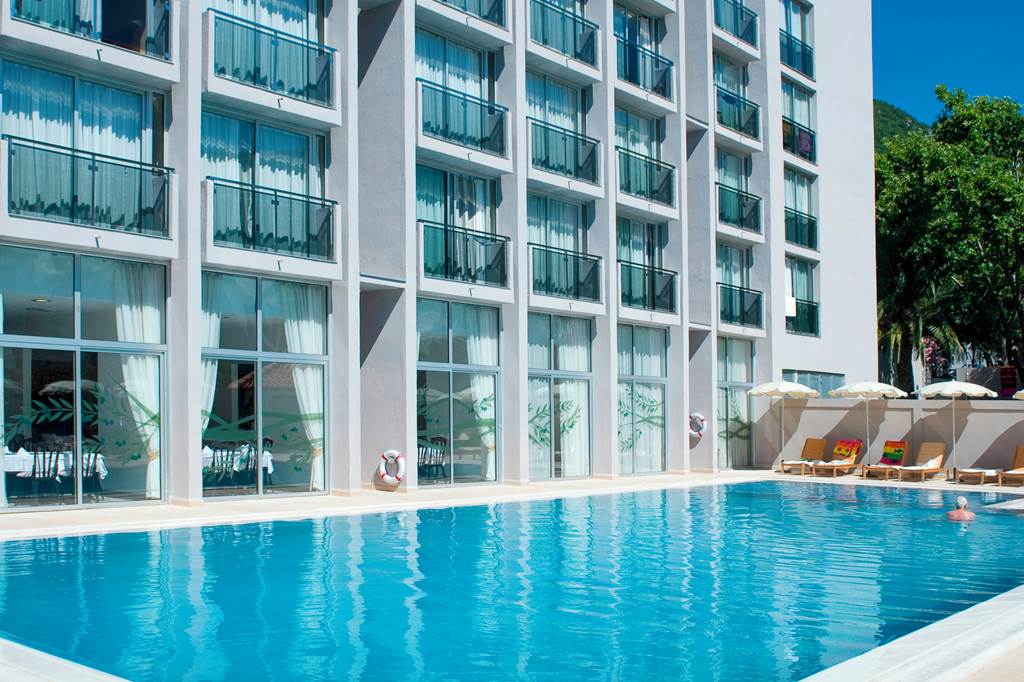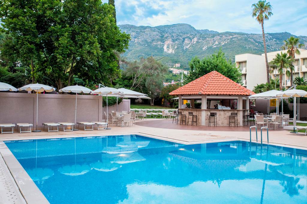 Becici Beach itself is just a short walk away, so you can switch between poolside and seafront as the mood takes you. The beach is long and mostly pebble‑and‑sand, with sections where you can hire loungers and parasols, plus water sports stands in season operated by independent providers.