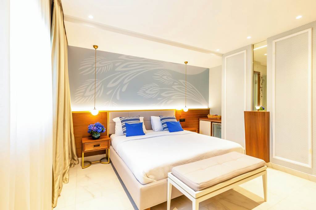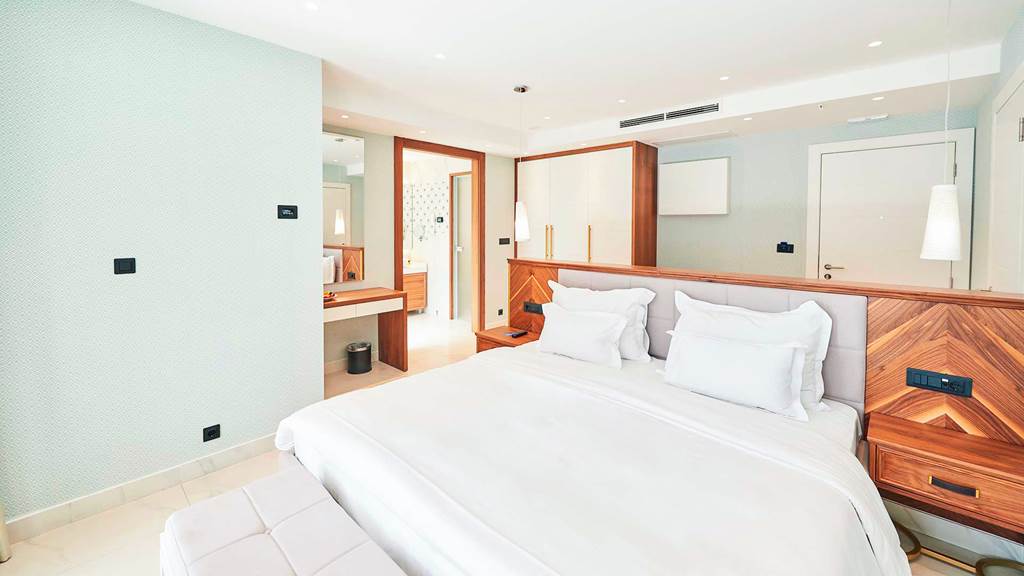 Expect bright, modern spaces with clean lines and a calming, coastal-inspired palette. Most rooms feature a private balcony or terrace – some overlooking the mountains and gardens, others opening up to partial or full bay views.