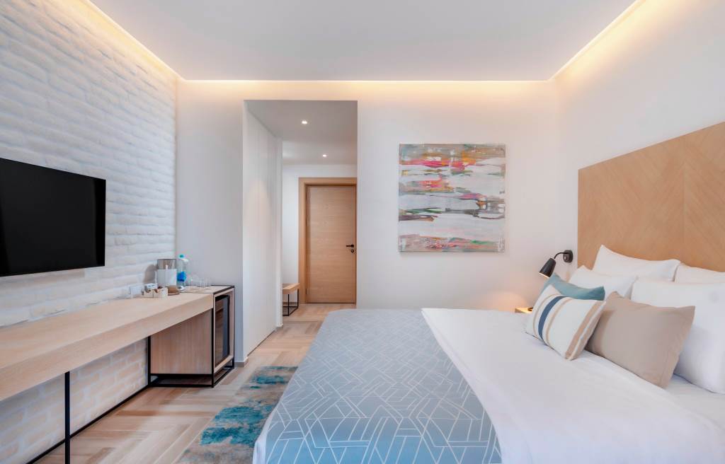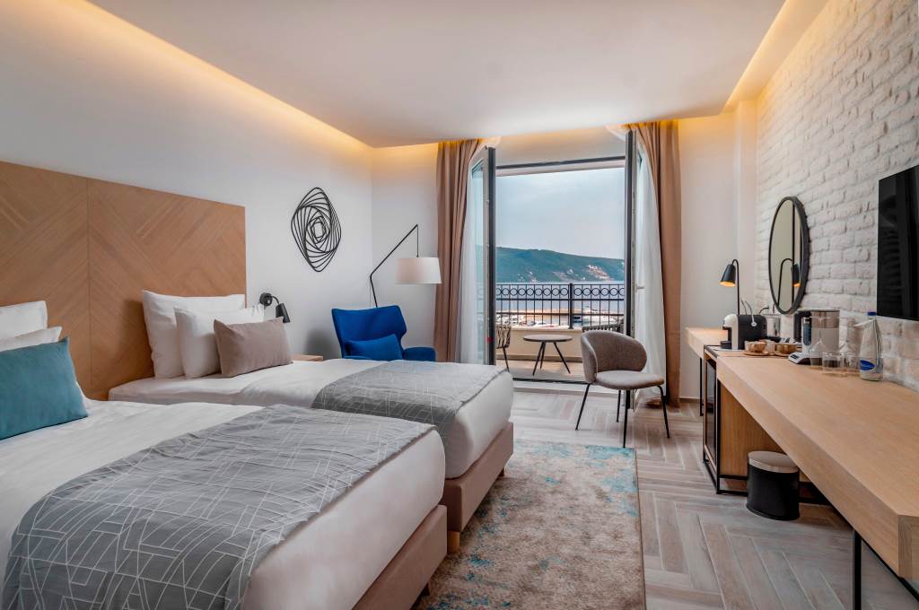 Positioned to maximise the outlook over the marina and Bay of Kotor, these rooms upgrade you to a balcony or Juliet balcony in most cases, with seating for enjoying the sea air. Interiors are light and calming, with neutral tones, quality linens and carefully chosen design pieces.