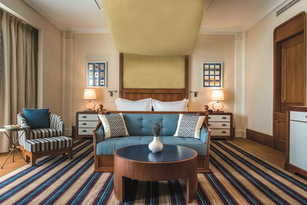 Beautifully styled in a nautical‑chic palette of creams and blues, Deluxe Rooms feel like a private cabin aboard a superyacht. Expect high ceilings, plush bedding, marble bathrooms and large windows – many with balconies – that make the most of the light. Amenities typically include free Wi‑Fi, air‑conditioning, flat‑screen TV, safe, minibar, tea and coffee facilities, bathrobes and slippers. Some rooms face the mountains or village, while others look towards the marina and bay.