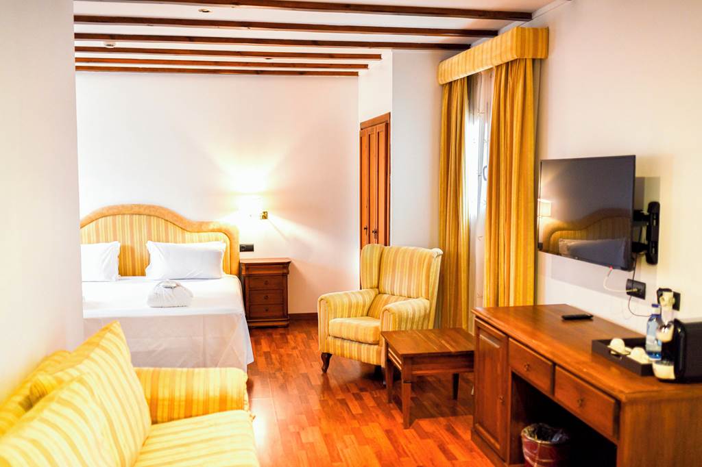 A comfortable base for solo travellers, with classic décor echoing the hotel’s bodega roots. Facilities include a flat-screen TV, Wi‑Fi, safety deposit box, hairdryer, fridge, air conditioning and a bathroom with bath with shower attachment or standalone shower. Daily cleaning, towel change and turndown service are included.