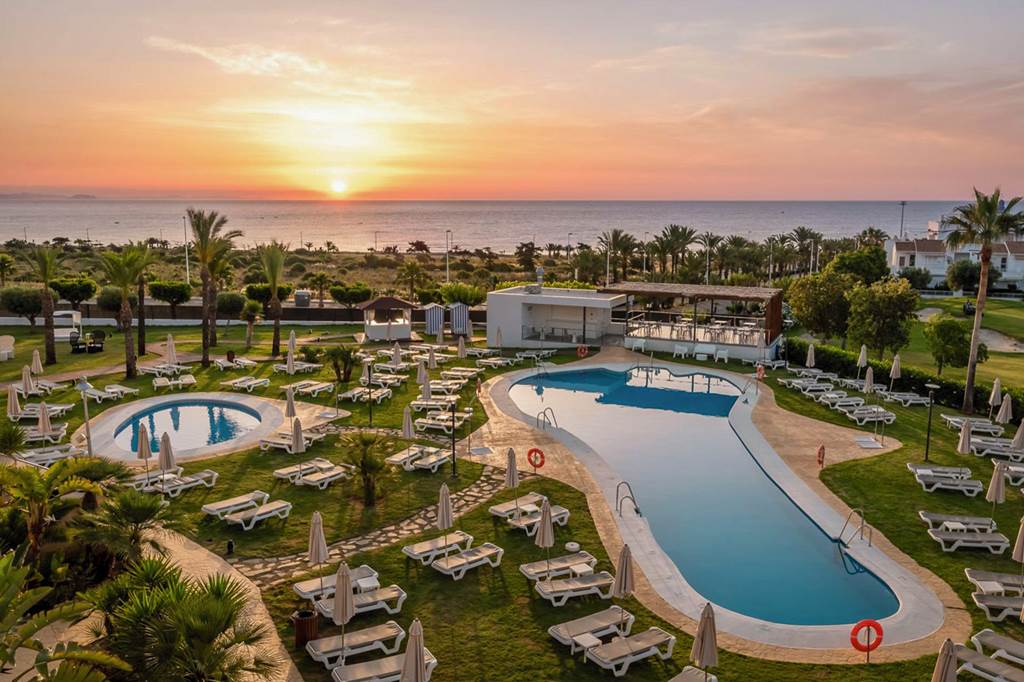 Once the summer residence of the Marquises of Chávarri, ALEGRIA Palacio Mojacar has been carefully reimagined as an adults-only seaside escape. Behind the original palace façade you’ll find a contemporary Spanish hotel wrapped in lush gardens, a lagoon-style pool lined with Bali beds, a spa with an indoor pool, and generous All Inclusive options. With the beach a short stroll away and Marina Golf Mojacar nearby, it’s a refined but relaxed base for exploring one of Andalusia’s most characterful stretches of coast.