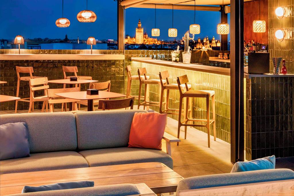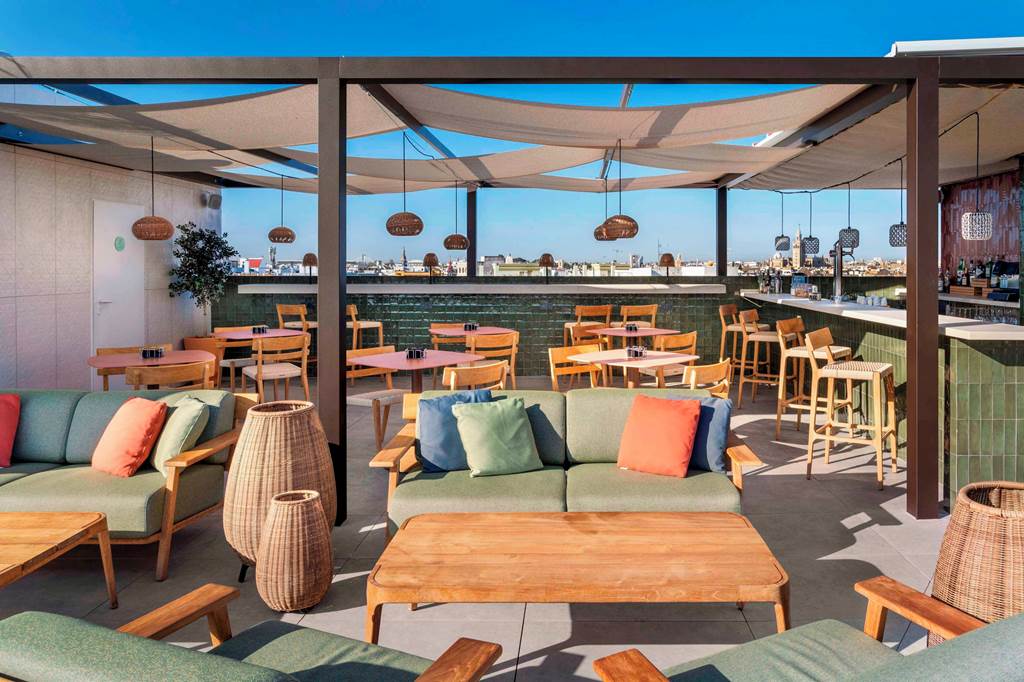 Head up to the rooftop terrace to discover one of the hotel’s standout features: a compact but stylish outdoor pool, surrounded by loungers and city views. It’s the ideal place to cool off after wandering through Seville’s sun-drenched streets, or to enjoy a quiet hour with a book between excursions.