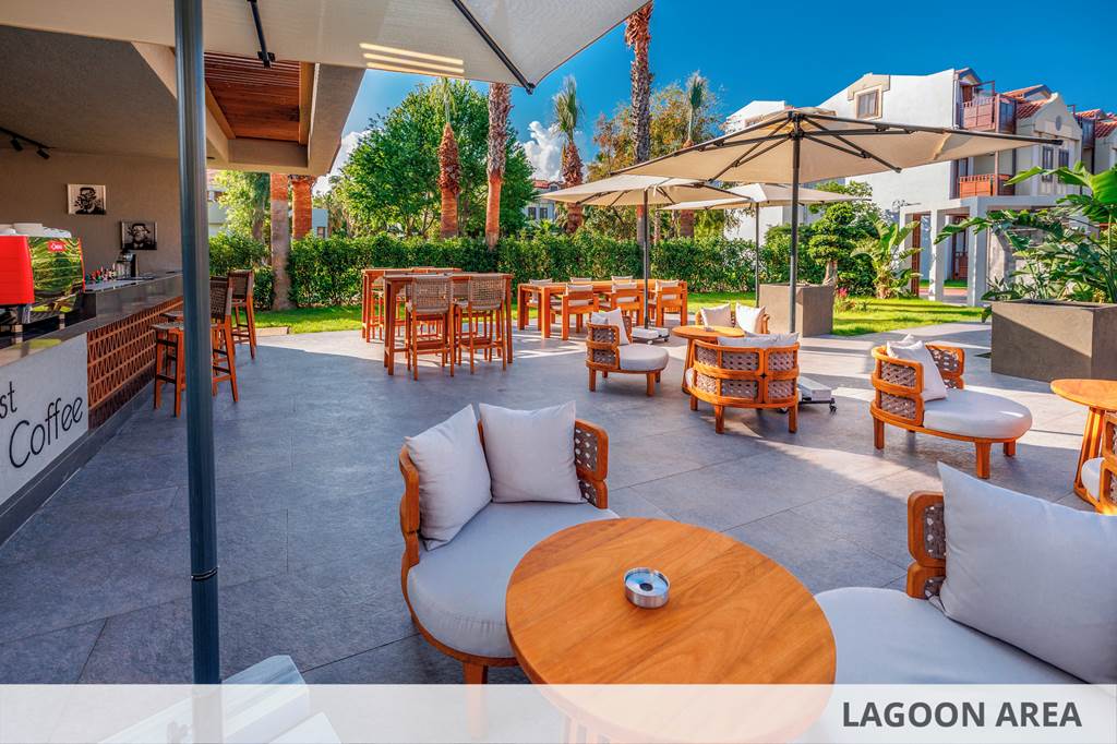 Wide-open sea views, swaying palms and a huge pool framed by lawns and tropical gardens set the tone at Club Tuana. Wander from your room through green pathways to the beachfront, drift between pool, aqua park and beach bar, then round off the day with sunset drinks and laid-back entertainment. It’s a classic Turkish resort atmosphere with everything dialled up a notch by the generous All Inclusive Plus offering.