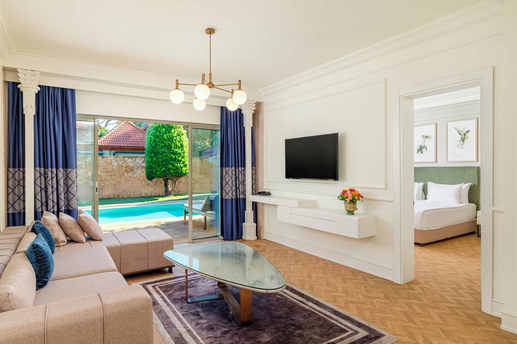 Sleeps 3–5. Inspired by Balinese design, these villas feature a private swimming pool, terrace with sunbeds, and two bathrooms with bath or shower and whirlpool bath. In-room comforts include TV, Wi‑Fi, safe, bathrobe and slippers, hairdryer, kettle, pillow menu, minibar (charge), turndown service, air conditioning and daily cleaning.
