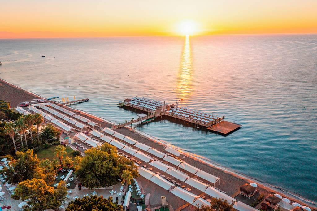 Picture a palm-framed pool scene, terracotta-roofed blocks peeking through the pines and the Taurus Mountains rising behind a sweep of Mediterranean coastline – that’s Kemer Holiday Club. This low-rise, garden-style resort runs right down to the beachfront and folds in an aquapark, adults-only pool, spa, kids’ club and an easygoing All Inclusive programme, making it a strong all-rounder for families and couples alike.