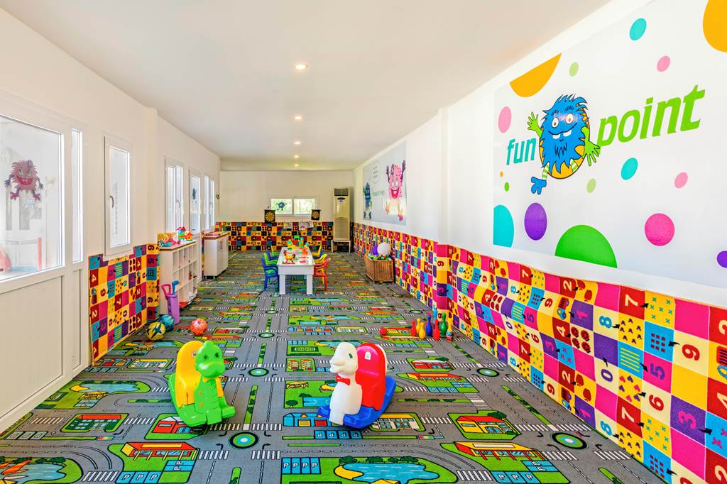 Yes. The hotel is very family‑friendly, with three outdoor pools including a children’s section, a waterslide pool, a splash park, a kids’ club for 4–12 year olds, a playground and children’s menus/highchairs in selected restaurants. Family bungalow and superior family bungalow rooms are designed with separate sleeping spaces for parents and children.