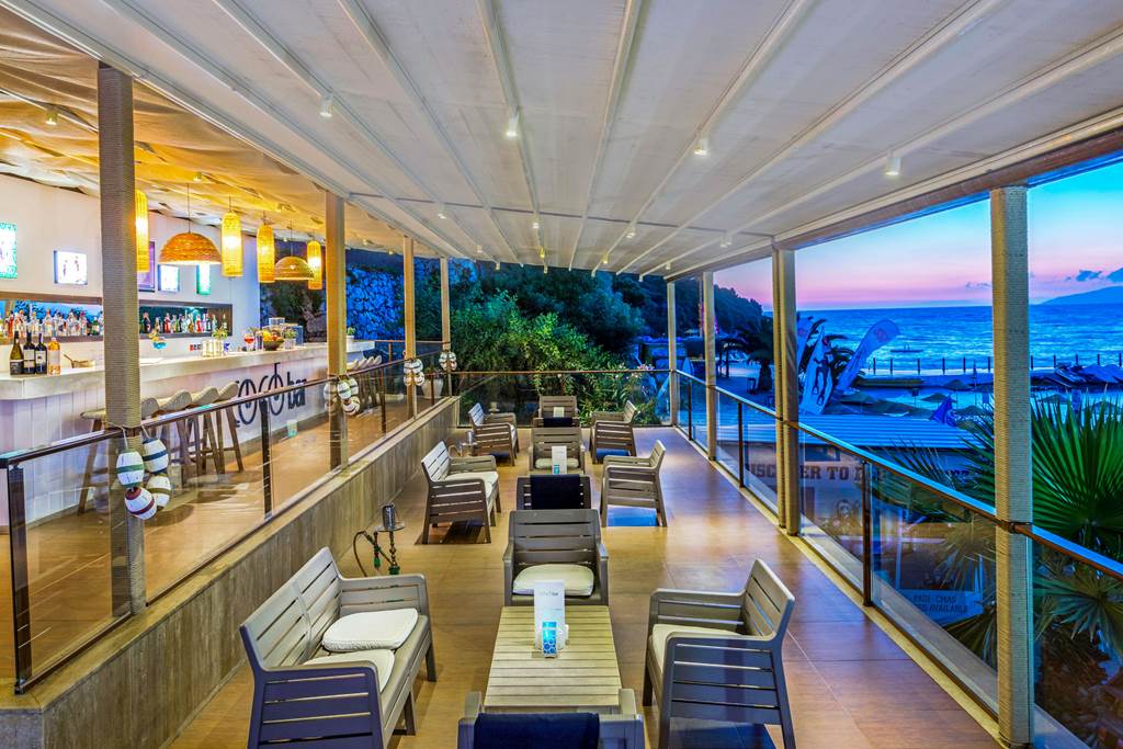 From the hillside, steps and paths take you down to the hotel’s man‑made beachfront area. You’ll find a sunbathing deck, sand/pebble beach section, a beach bar and an external water sports operator offering canoeing, pedalos, snorkelling, scuba diving and motorised water sports (extra charge; age restrictions apply). Pool towels are available with a refundable deposit.